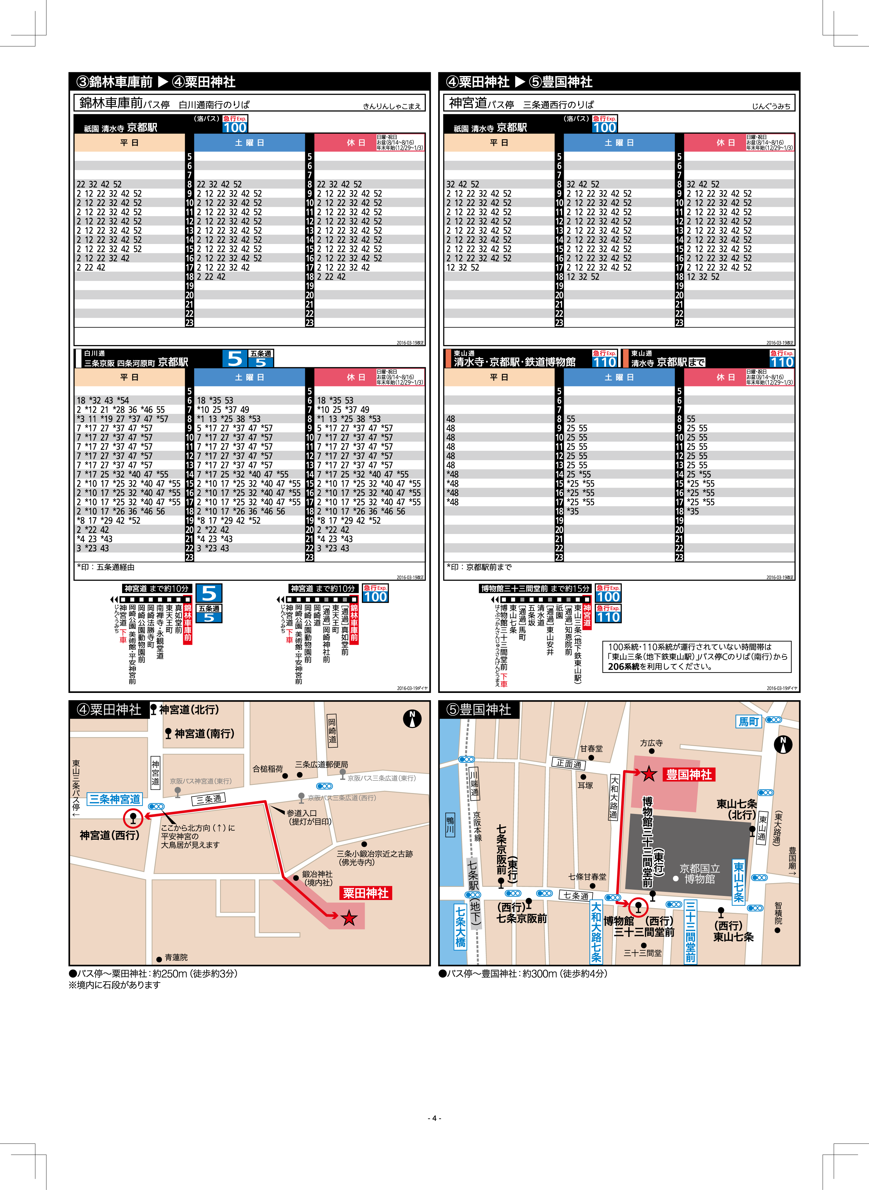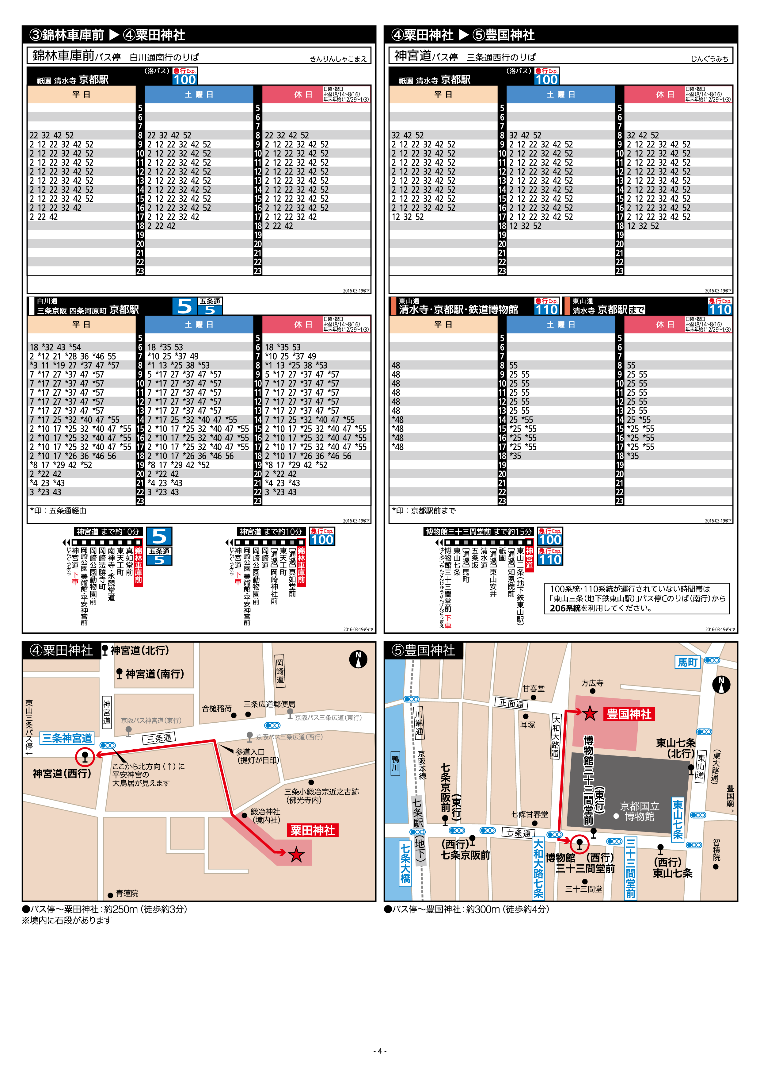 ・行楽シーズンは、粟田神社(神宮道バス停)→豊国神社(博物館三十三間堂前バス停)のバスが満員で乗車出来ない場合もあります。その場合、徒歩で東山三条バス停へ行って以下の系統に乗って下さい。